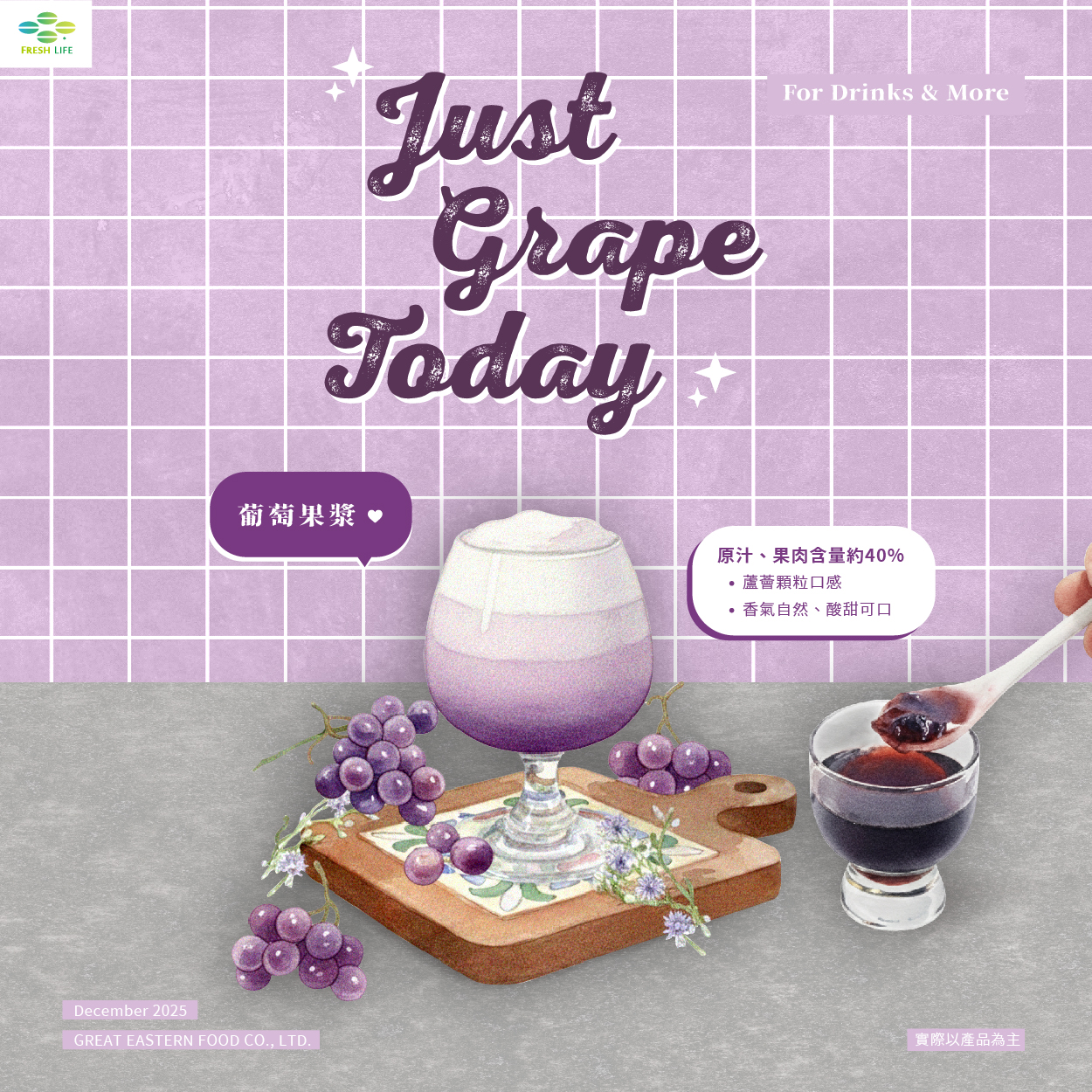 原汁、果肉含量40%左右,運用蘆薈顆粒增加果漿的口感豐富度,葡萄接近巨峰葡萄香氣風味自然酸甜可口。