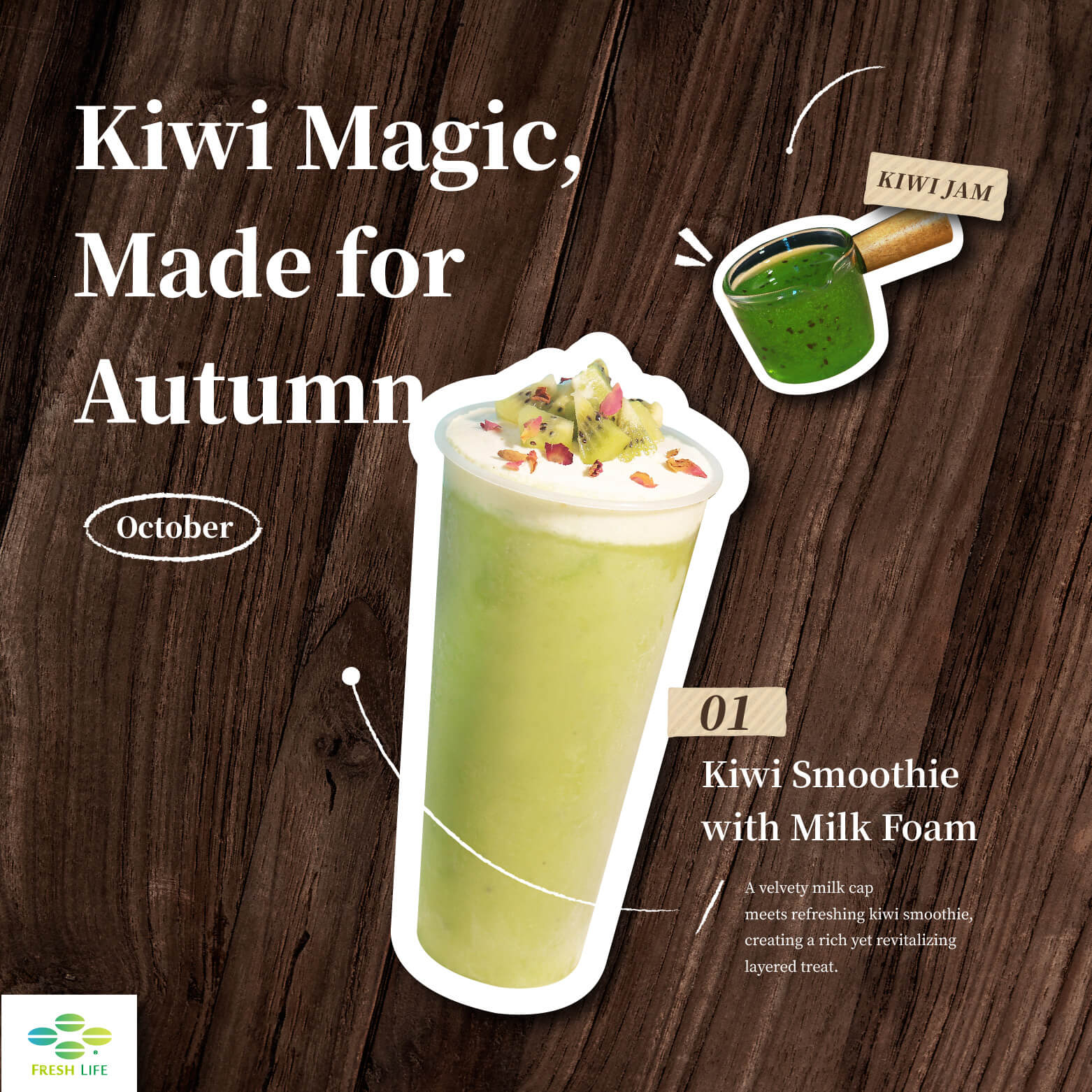 A velvety milk cap meets refreshing kiwi smoothie, creating a rich yet revitalizing layered treat.