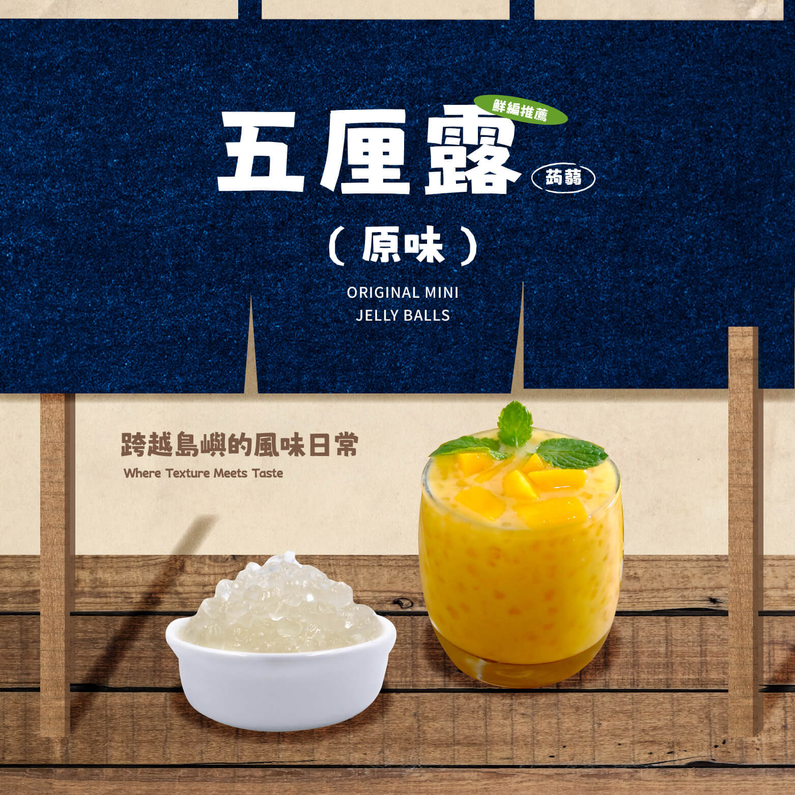 桂花凍、玫瑰凍、原味五厘露(蒟蒻)、零卡原味蒟蒻晶球與櫻花風味蒟蒻晶球,